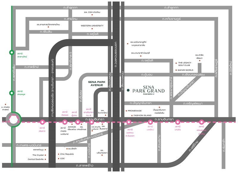 ใกล้รถไฟฟ้า MRT สายสีชมพู สถานีรามอินทรา กม.9 รายล้อมด้วยสิ่งอำนวยความสะดวกรองรับทุกไลฟ์สไตล์ เช่น Fashion Island, The Promenade, Central Eastville, ปัญญามาร์เก็ต, รร.บดินทร์เดชา 2, รร.เลิศหล้า, รร.นานาชาติ KPIS, รพ.อินทรารัตน์, รพ.สินแพทย์ รามอินทรา, Siam Amazing Park และ Safari World เป็นต้น